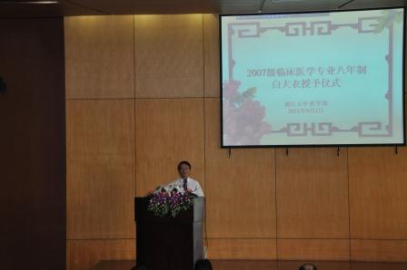 2011年9月1日 下午,2007级临床医学专业八年制学生白大衣授予仪式在医学部科研楼辅楼二楼大报告厅举行。仪式由医学部副主任沈华浩主持,医学部党委副书记张小玲、浙医二院外科研究所所长彭淑牖、浙医一院心血管内科主任朱建华、基础医学系副主任夏强、公共卫生系副主任曾群力、生物化学与遗传学系教授张咸宁、医学部教学办主任俞方、本科生教育科科长刘有恃、副科长韩魏等出席了仪式。
