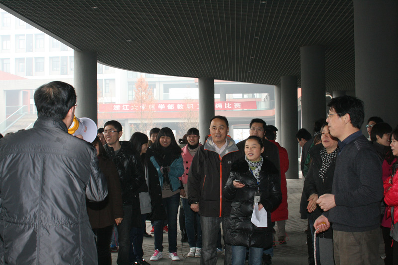 初冬的午后,细雨夹着微微的凉意,但在紫金港医学部综合楼前广场上却是一番热火朝天的景象。2011年12月20日中午,我部工会健身月活动系列活动之一---趣味跳绳比赛正在紧张地进行着。医学部党委副书记、工会主席吴弘萍宣布比赛正式开始,来自药学院、基础医学系、公共卫生系和学部机关共8支参赛队伍开始了这一场精彩地角逐。趣味跳绳比赛设单人跳、男女双人跳和集体跳(五人组合)等项目,最终以规定时间内次数多少决定名次。