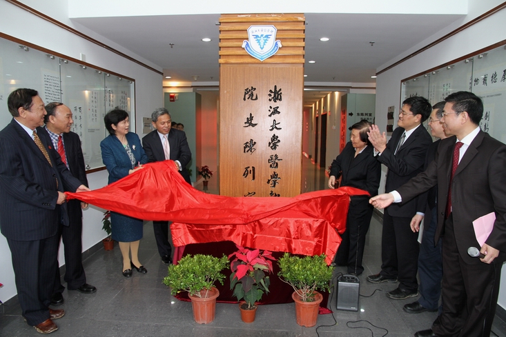 在浙江大学医学部百年华诞庆典临近之日,5月25日下午,医学部在综合楼二楼隆重举行院史陈列室揭牌以及《百年浙医》发行仪式。校党委副书记任少波,医学部主任段树民院士等领导班子成员,郑树森院士、李兰娟院士,原浙江医科大学领导郑树、吕世亭、陈昭典、黄书孟以及部分医学部师生参加了仪式。仪式由医学部党委书记黄河主持。