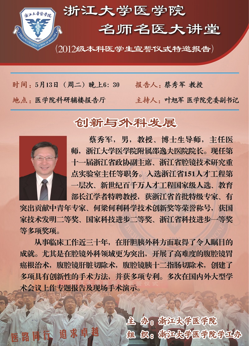 医学院名师名医大讲堂(第六讲)——蔡秀军院长讲座的通知
