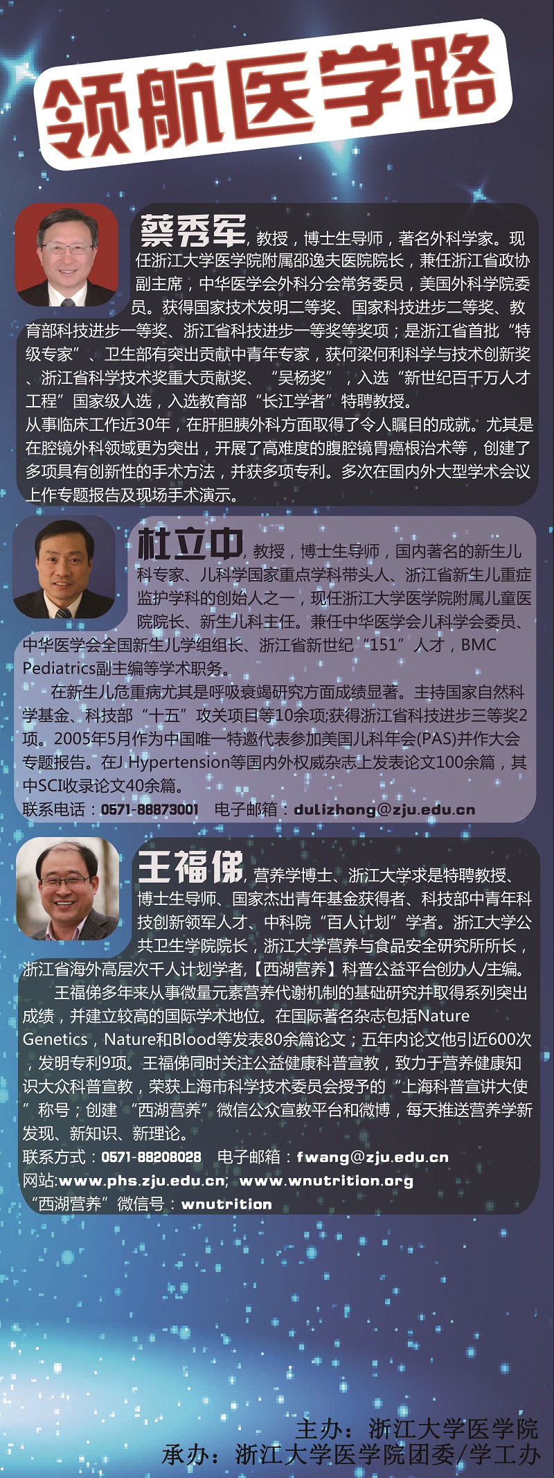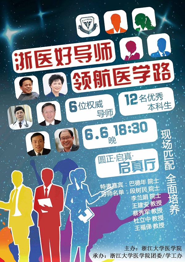 为落实浙江大学六高强校“培养时代高才”战略,充分利用和发挥医学院在卫生事业管理、医学研究和临床方面的优势,学院推出了“浙医好导师 领航医学路”英才培养计划。在低年级本科生中选拔综合素质优秀的学生匹配优秀的专业导师进行全面培养。并通过该活动,以点带面,让更多同学了解导师团队的情况及杰出医学人才的素质要求,激励和引导更多同学主动联系导师,开展科研和临床训练。