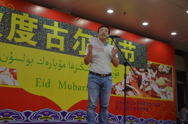2014年10月5日晚,浙江大学紫金港校区清真餐厅内热闹非凡。由浙江大学党委学生工作部主办、医学院承办的古尔邦节庆祝活动在此举行,全校包括新疆少数民族学生、留学生等在内的240余名师生齐聚一堂,载歌载舞,欢庆传统节日。学工部部长邬小撑、研工部副部长陈凯旋、校团委副书记沈黎勇、医学院党委副书记叶旭军及拥有新疆少数民族学生的各学院、学园的领导和辅导员参加庆祝活动,与同学一起共度佳节。