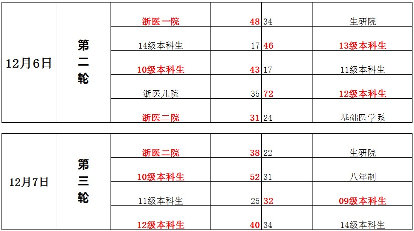 浙医一院,浙医二院,09级本科生,10级本科生的队员携手下连胜三场球赛,在积分榜中现并列第一。
