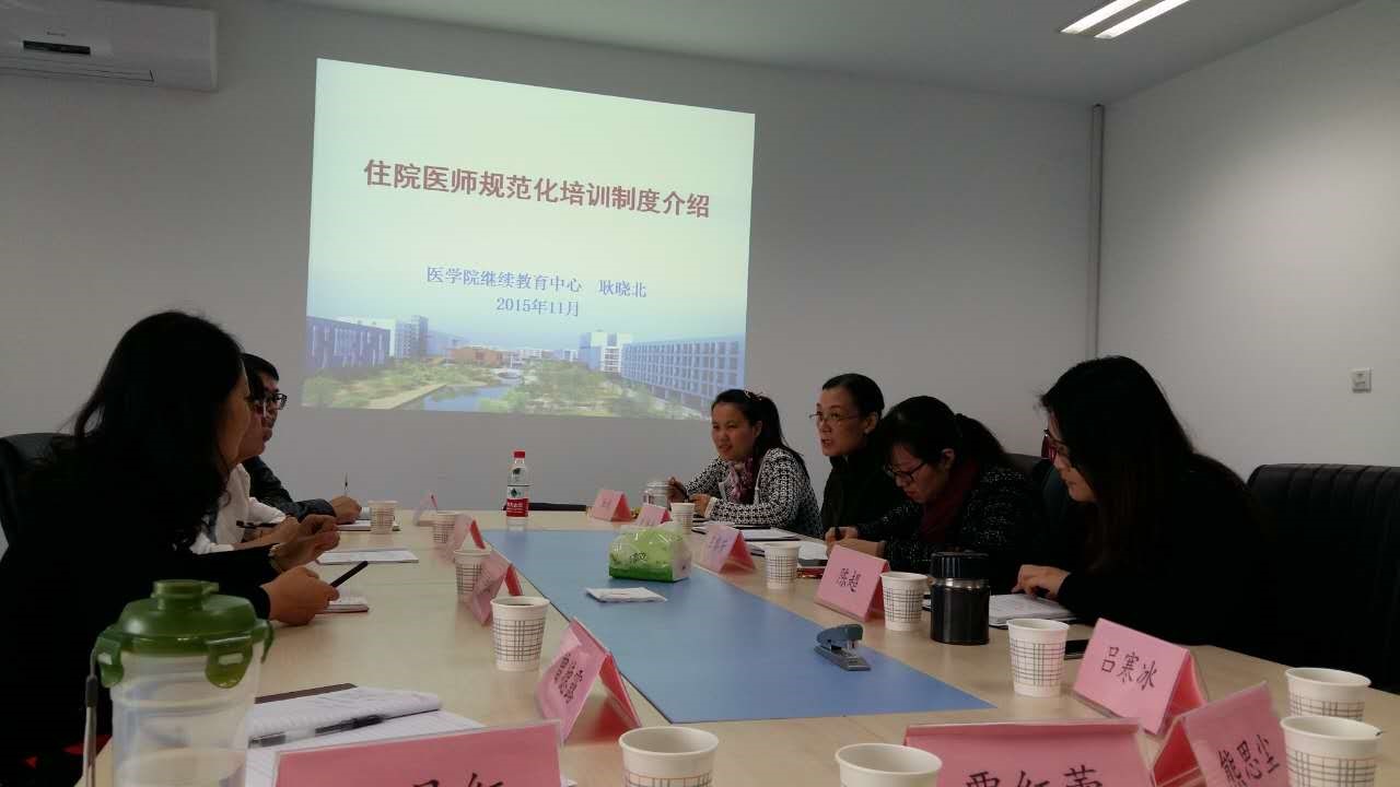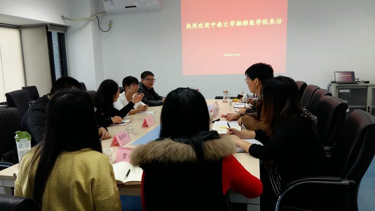 2015年11月4日上午,中南大学湘雅医学院学生工作办公室一行4人来访,就学生管理,就业指导、住院医生规范化培训等主题与学院学工办、继续教育办公室相关人员进行交流探讨。