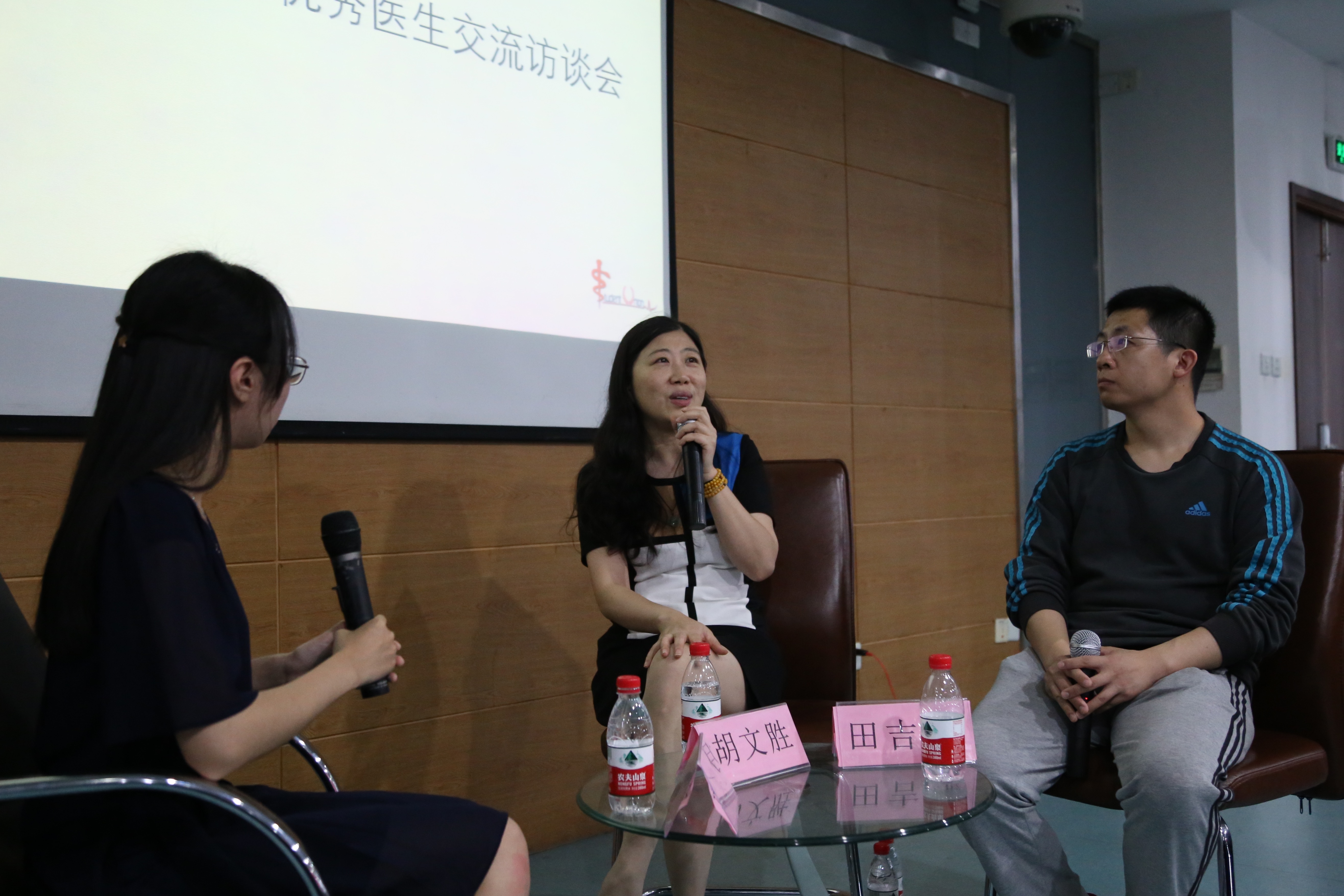 代表了在场全体医学院的主持人张黎悦主席也对于医学生们所关心的就业问题对两位嘉宾进行了相关提问,仍然奋斗在临床一线的胡老师和已经走出体制的田医生一致肯定,一名优秀的临床医生必须具备各方面的素质,包括创新思维与接受学习的能力等。交流会的内容还涉及到了现在较热的医疗与互联网相结合、在私立医院从业等问题。在现场观众的提问环节中,各校代表团都对两位嘉宾进行了提问,所涉及的都是作为一名在读医学生所关注,并且迫切想要得到指导的问题,例如学习基础医学知识和科研能力的培养是否应该同时进行,医院在招收应届毕业生时的要求等等。