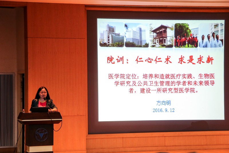 方向明副院长介绍了学院本科教学情况。她从院训“仁心仁术,求是求新”开始向新同学介绍了学院相关情况,阐述了学院的历史沿革、人才培养目标、学生培养模式等,并给同学们推荐了大学阶段可以阅读的课外书籍。