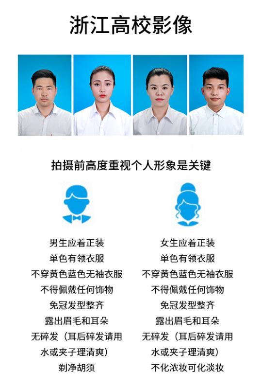 5. 请按影像拍摄要求免冠、着正装,保持服装整齐、仪容仪表整洁端庄;为免影响图像效果,不宜穿着黄色衣服。
