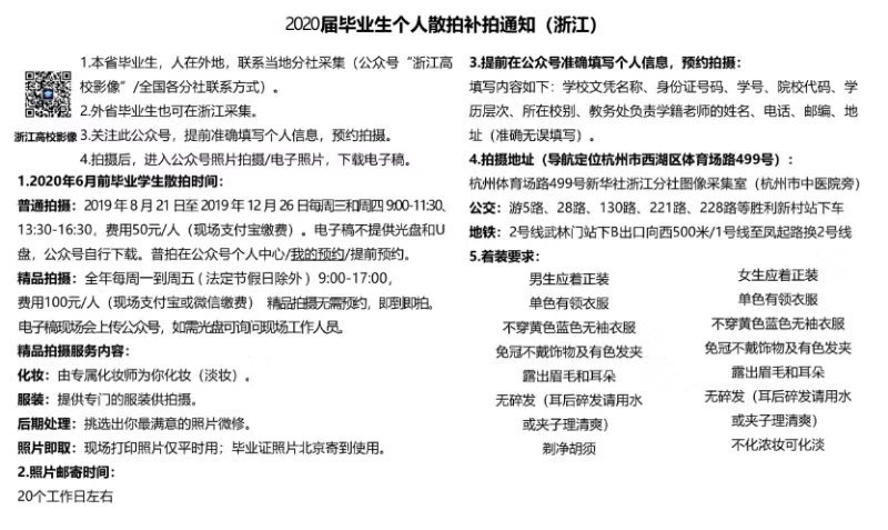 根据省教育厅、新华社浙江分社高校毕业生图像采集中心有关文件精神和我校的工作安排,2020届本科毕业生信息核对及图像信息采集即毕业照拍摄工作定于2019年11月13日开始(具体拍摄时间和地点见附件1)。为切实做好该项工作,现将有关事项通知如下。