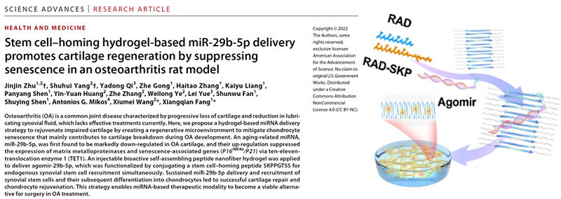 当地时间2022330日,日韩欧美福利视频_黑人巨大人精品欧美三区_欧美成人另类人妖_欧美在线精品一区二区三区_欧美一区二区三区性视频_日韩精品欧美视频_性欧美极品xxxx欧美一区二区附属邵逸夫医院骨科团队的研究论文“Stem cell-homing hydrogel-based miR-29b-5p delivery promotes cartilage regeneration by suppressing senescence in an osteoarthritis rat model”Science Advances杂志在线发表。该研究提出了一种基于干细胞募集水凝胶递送miRNA的抗衰老治疗OA新策略,通过构建再生微环境来减轻软骨细胞衰老,补充新鲜的软骨细胞,从而使因OA受损的软骨恢复活力。同时,相关研究成果申请了国家发明专利1。日韩欧美福利视频_黑人巨大人精品欧美三区_欧美成人另类人妖_欧美在线精品一区二区三区_欧美一区二区三区性视频_日韩精品欧美视频_性欧美极品xxxx欧美一区二区附属邵逸夫医院的诸进晋博士为第一作者,通讯作者为日韩欧美福利视频_黑人巨大人精品欧美三区_欧美成人另类人妖_欧美在线精品一区二区三区_欧美一区二区三区性视频_日韩精品欧美视频_性欧美极品xxxx欧美一区二区附属邵逸夫医院方向前教授以及清华大学王秀梅教授。