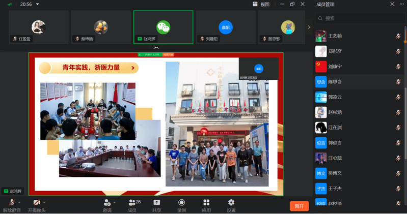 为进一步凝聚共识、动员力量,激励支部党员以昂扬向上的斗志和奋发有为的精神状态投入到当前各项学习和工作中,2022年11月30日,临床医学本科生第三党支部通过钉钉会议的形式线上开展党员大会暨学习贯彻党的二十大精神。本次党员大会特别邀请到了临床医学本科生第一党支部书记赵鸿辉作党课分享,支部党员、发展对象及各团支部书记共27人参加会议。会议由党支部书记刘晨阳主持。
