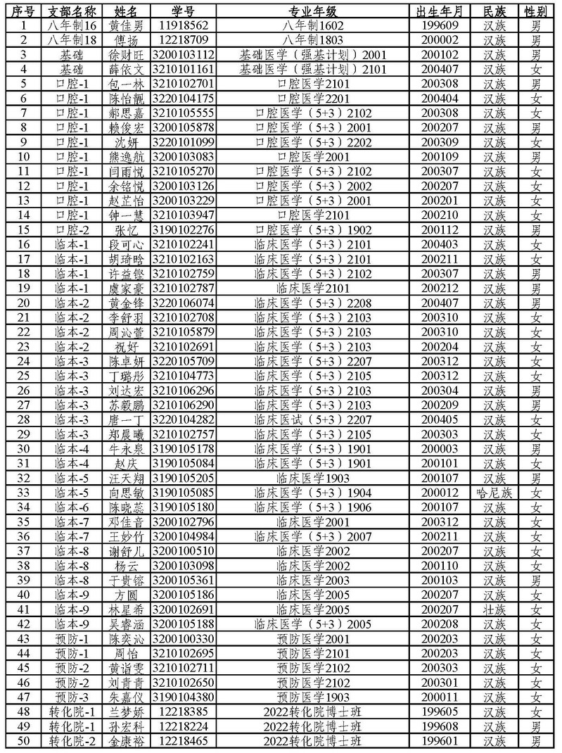 经医学院各支部委员会研究,报医学院上级党组织备案同意,拟近期发展黄佳男等50名同志为中共预备党员,现予以公示。