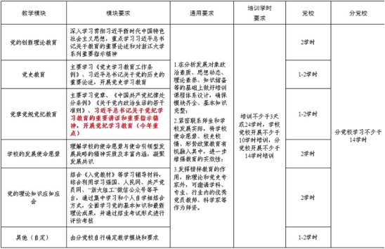 1.主要开展党的创新理论教育,尤其是习近平新时代中国特色社会主义思想教育;开展党性教育,尤其是党章党规党纪、党的宗旨、党的光荣传统和优良作风教育、“四史”学习教育等,具体教学安排和内容要求参照下表。