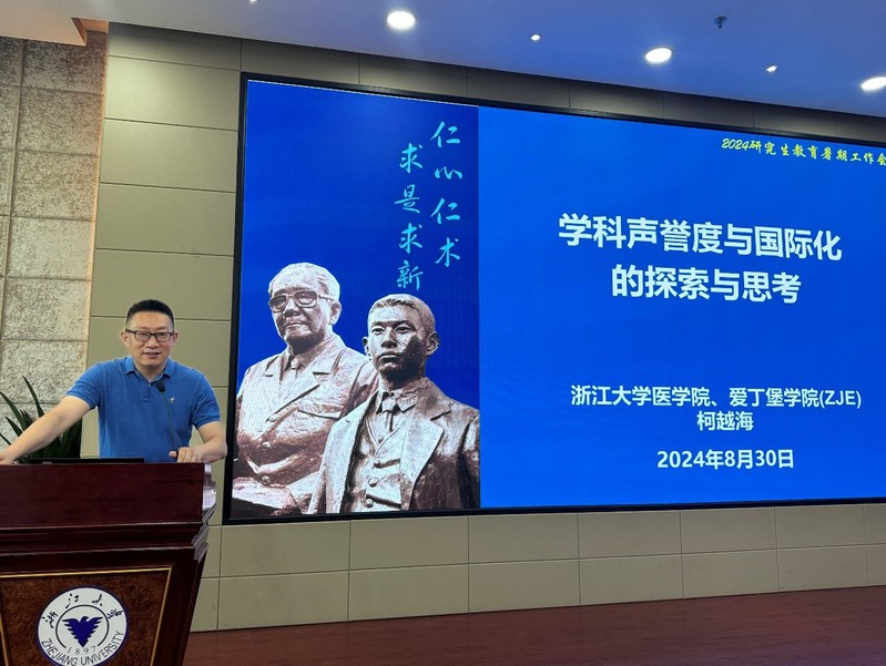 柯越海作《学科声誉与国际化培养的探索与思考》专题报告,他分析了当前国际新形势及医学学科发展态势,介绍了浙江大学爱丁堡联合学院(ZJE)在国际化课程、师资队伍建设、平台搭建、学术驱动等方面提升国际化培养水平的经验做法,强调要丰富世界优秀学科内涵,汇聚优秀学科资源,聚焦国际科技前沿与人才培养,提升国际声誉。