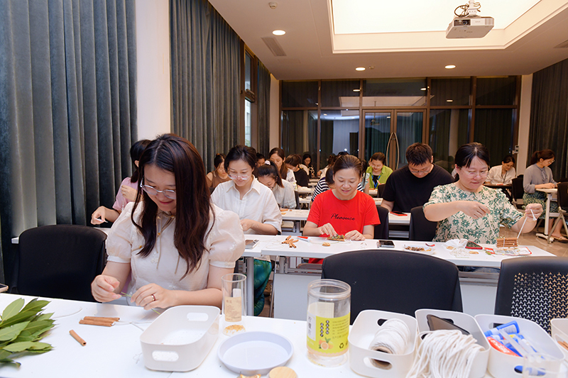 挂饰手作,留住美好。教师们利用干桂花、桂皮、柏树枝、丝带等材料,制作出各式美观的挂饰,寓意“桂”人多旺事。通过动手实践,教师们陶冶了情操,留下了节日的美好记忆。