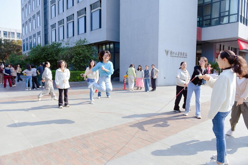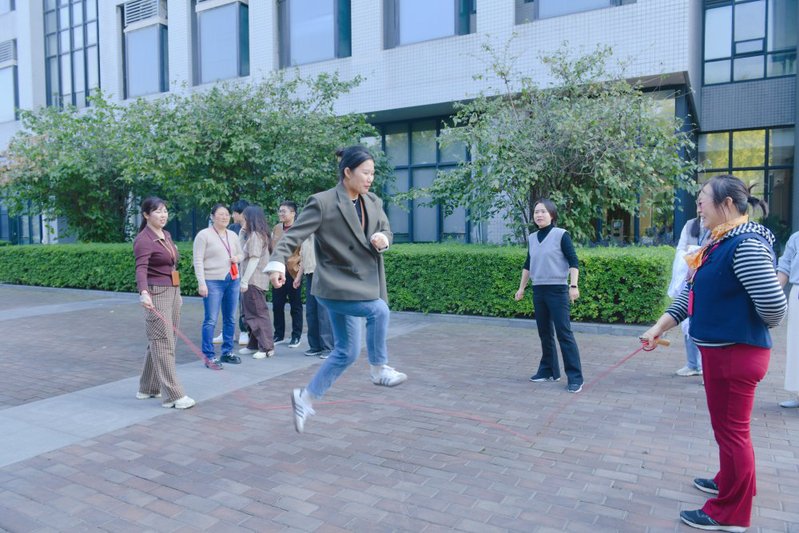 本次活动精心设计了“移动抓杆”与“幸福8字环绕”两大趣味项目。在“移动抓杆”项目中,参赛者每人手持一根活动杆,围成一个圆圈。在保持杆不倒的情况下,他们需按照顺时针方向迅速移动,并将右手掌心按到相邻同伴的杆上,连续换位,用时最短者胜出。 而“幸福8字环绕”项目则更具挑战性,10名教职工组成一队,集体穿梭于跳绳之间,按照既定顺序完成比赛,展现了团队的默契与协作。