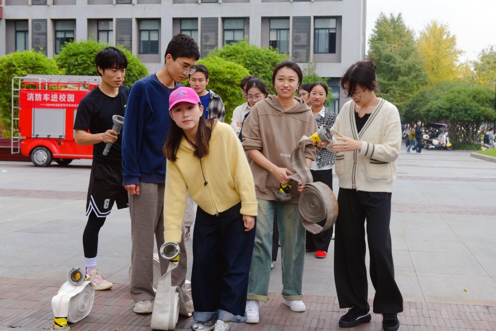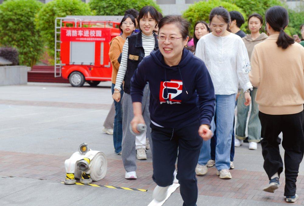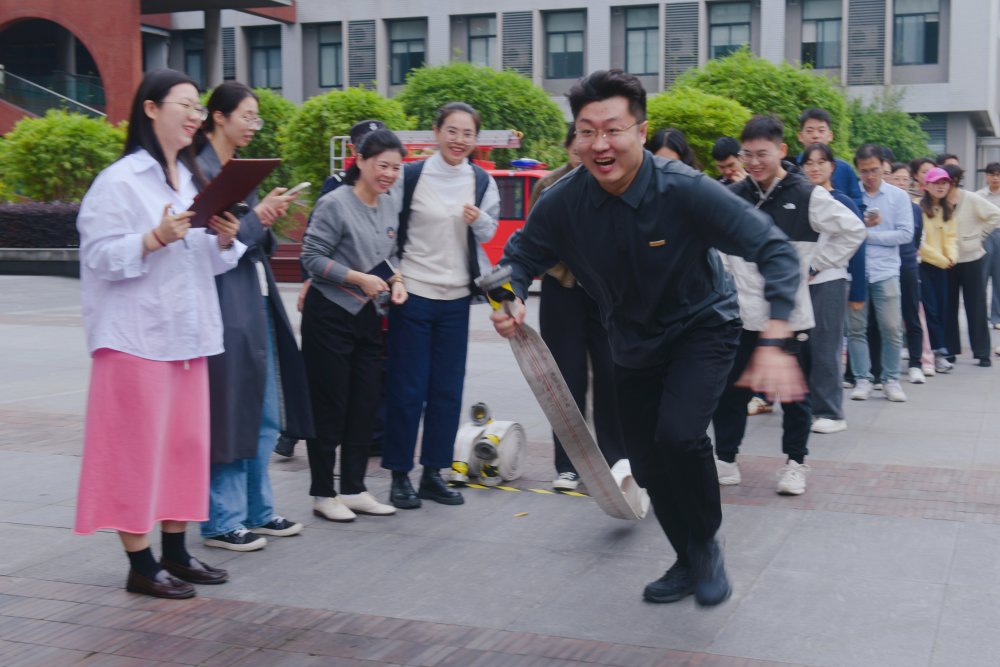 比赛模拟在火灾现场中的团队协作场景,需要参赛者使用消防水带和灭火器进行灭火操作。赛前,校安全保卫处防火办谢波示范了灭火器的正确使用方法及注意事项。比赛过程中,由校部学院机关、各院系及各实验室师生组成的35支队伍以练促学,展开了激烈角逐。