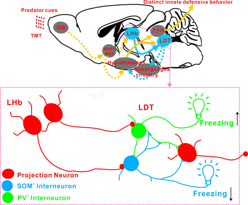 A research conducted by the team of Prof. Shumin Duan and Hao Wang from Institution of Neuroscience, School of Basic Medical Sciences discovered new circuit mechanisms for innate fear. This finding was published in Nature Neuroscience on Jan 4th, 2016. Innate fear plays a critical role in survival and heath for all species, including human being. This intense emotion induced by a perceived threat through sensory stimuli is vital for animals to avoid danger, thus could survive. On the other hand, abnormal fear such as phobia is highly associated with anxiety and depression disorders. The features of heritability and natural acquisition distinguish innate fear from conditioned fear. The former is innate while the latter requires previous experiences. Unlike conditioned fear, the neuronal circuitry underlying innate fear is largely unknown. The team led by Shumin Duan and Hao Wang employed optogenetics, behavioral assays and retrograde rabies virus tracing techniques, and they found that projection from the lateral habenula to the laterodorsal tegmentum plays a key role in the olfactory cue-induced innate fear in mice. Furthermore, they found two interneuron subtypes (PV+ and SOM+) antagonistically regulated fear responses. These results provided a potential target for therapeutic intervention for anxiety and depression disorders.