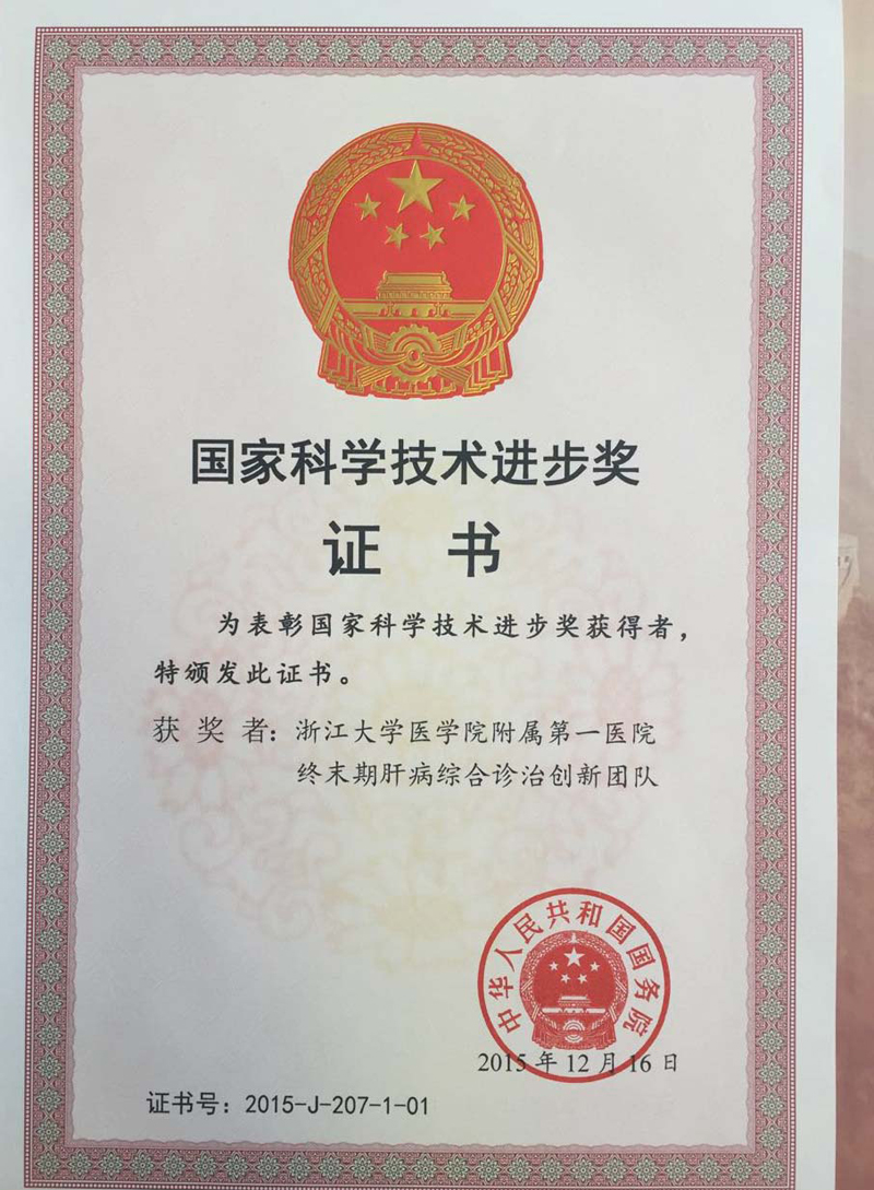 January 8th 2016, the annual conference of National Science and Technology Progress Award was held in Great Hall of the People. The Research Group of End-Stage Liver Disease Comprehensive Diagnosis and Treatment co-led by Shuseng Zheng and Lanjuan Li who are Academician of China Academy of Engineering was awarded National Team Prize for Progress in Science and Technology, and the prize represents the highest appreciation for scientific research team in the country. It is the first National Team Prize for Progress in Science and Technology in Medical area in Zhejiang Province.