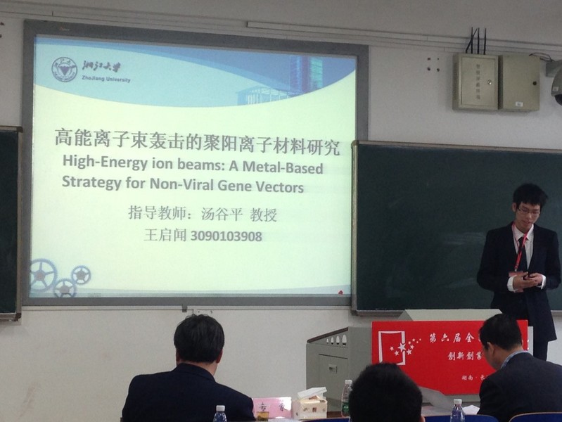 Under the guidance of Professor TANG Guping, I focused on the rare-earth-incorporated polymeric vector for enhanced gene delivery and published an article paper on Biomaterials (IF = 10.317) as the first author. This project was also supported by the National College Students' Innovation and Entrepreneurship Training Program and the undergraduate thesis also awarded as the Top 100 Excellent Undergraduate Thesis of ZJU. In 2014, as the only elected student representative of ZJU, I participated in the 6th national innovation annual conference of college students held in Central South University and made an academic lecture.