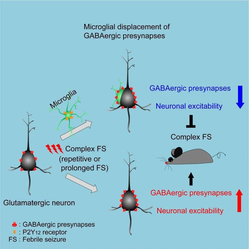 In the study, researchers discovered that activated microglia ensheathe glutamatergic neuronal soma and displace, but do not phagocytose, GABAergic presynaptic terminals during complex FSs. This observation led them to investigate the role of microglia-mediated presynaptic displacement in the pathological process of complex FSs. Patch-clamp electrophysiology confirmed that the microglial displacement of GABAergic presynapses abrogates a complex-FS-induced increase in GABAergic neurotransmission and neuronal excitability, whereas GABA exerts an excitatory action in this immature stage. Pharmacological inhibition of microglial displacement of GABAergic presynapses or selective ablation of microglia in CD11bDTR mice promotes the generation of complex FSs. Blocking or deleting the P2Y12 receptor (P2Y12R) reduces microglial displacement of GABAergic presynapses and shortens the latency of complex FSs. Together, microglial displacement of GABAergic presynapses, regulated by P2Y12R, reduces neuronal excitability to mitigate the generation of complex FSs.