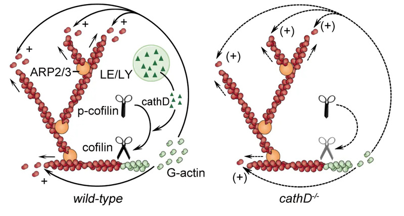 Organelle transport requires dynamic cytoskeleton remodeling, but whether cytoskeletal dynamics are, in turn, regulated by organelles remains elusive. This work demonstrates that late endosomes, a type of prelysosomal organelles, facilitate actin-cytoskeleton remodeling via cytosolic translocations of immature protease cathepsin D (cathD) during microglia migration. After cytosolic translocations, late endosome–derived cathD juxtaposes actin filaments at the leading edge of lamellipodsia. Suppressing cathD expression or blocking its cytosolic translocations impairs the maintenance but not the initiation of lamellipodsial extension. Moreover, immature cathD balances the activity of the actin-severing protein cofilin to maintain globular-actin (G-actin) monomer pool for local actin recycling. This research identifies cathD as a key lysosomal molecule that unconventionally contribute to actin cytoskeleton remodeling via cytosolic translocations during adenosine triphosphate–evoked microglia migration. This research highlights late endosomes as novel modulators of actin dynamics via cytosolic translocations of cathD, and identifies cathD as a key lysosomal molecule that unconventionally contribute to actin cytoskeleton remodeling during ATP-evoked microglia migration.