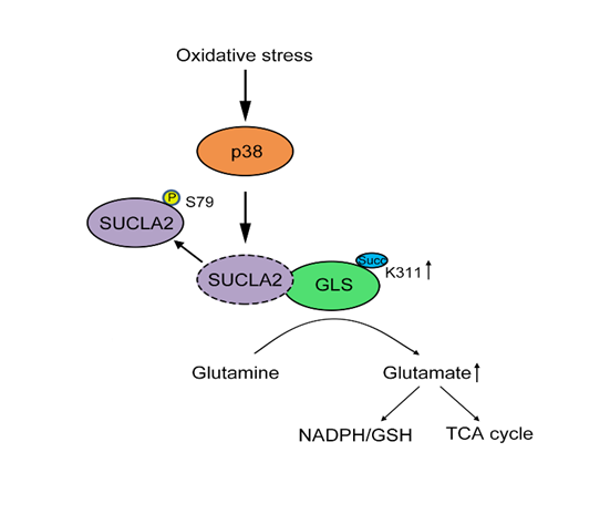 In the current report, Dr. LU 's group demonstrated that GLS is highly expressed in PDAC specimens with correspondingly upregulated glutamine dependence for PDAC cell proliferation. Importantly, succinyl-CoA caused GLS succinylation at evolutionarily conserved lysine311 (K311). GLS K311 succinylation promoted the conversion of GLS from monomer to active tetramer, thus improving its catalytic activity and enhancing glutaminolysis. Under the conditions without oxidative stress, mitochondrial SUCLA2 (succinate-CoA ligase ADP-forming subunit beta), an enzyme catalyzing the conversion of succinyl-CoA to succinate, associates with GLS, thereby reducing local succinate-CoA and suppressing GLS succinylation and activity. However, oxidative stress that happens unavoidably during tumor growth disrupted the association between GLS and SUCLA2 through p38-dependent SUCLA2 phosphorylation at S79, resulting in increased K311 succinylation. Activated GLS increases glutaminolysis to counteract oxidative-stress-induced ROS and apoptosis for supporting tumor growth.