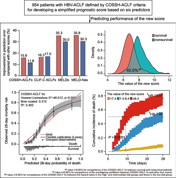 On this basis, LI Jun et al. conducted a follow-up study on patients with acute deterioration of HBV-related chronic liver disease from the prospective open cohort of the COSSH study. Six predictive factors were significantly related to the 28-day mortality and constituted a new prognostic score (=1.649×ln(international normalized ratio)+0.457×hepatic encephalopathy score+0.425×ln(neutrophil)+0.396×ln(total bilirubin)+0.576×ln(serum urea)+0.033×age). The new prognostic score based on six predictors without an assessment of organ failure can accurately predict and easily stratify the short-term mortality of patients with HBV-ACLF and might be used for early prognosis to decrease the high mortality. This work was published in an article entitled “Development and validation of a new prognostic score for hepatitis B virus-related acute-on-chronic liver failure” in the Journal of Hepatology on June 3.