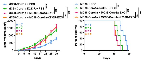 Furthermore, researchers found MC38-Coro1a-K233R tumour-bearing mice exhibited faster tumour growth and shorter survival than MC38-Coro1a tumourbearing mice, inhibiting that a decrease in neddylated Coro1a enhances the production of tumour EVs, thereby promoting tumour progression, indicating that neddylated Coro1a is an ideal target for the regulation of EV biogenesis.