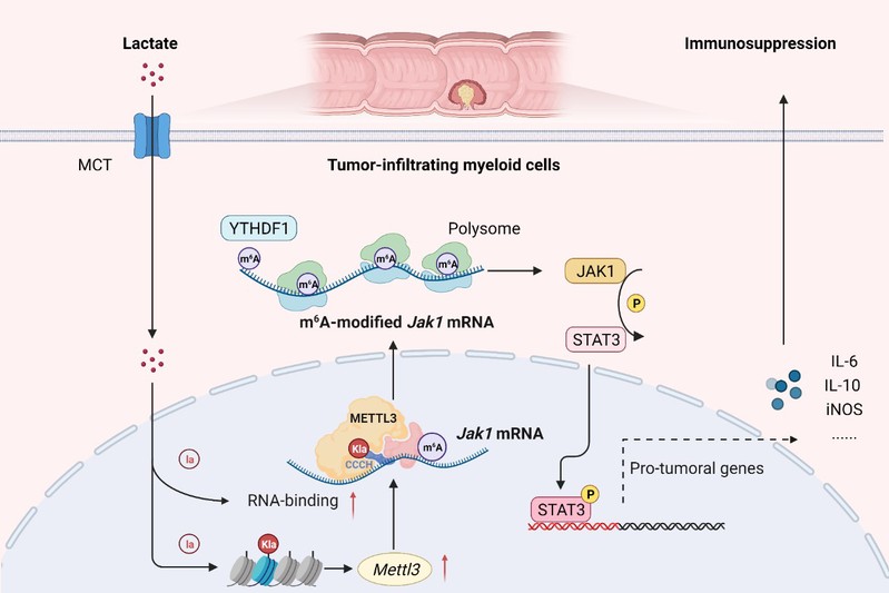 In this study, it is found that increased expression of METTL3 in TIMs was correlated with the poor prognosis of colon cancer patients and myeloid deficiency of METTL3 attenuated tumor growth in mice. METTL3-mediated m6A modification on Jak1 mRNA in TIMs, m6A-YTHDF1 axis enhanced JAK1 protein translation efficiency and subsequent phosphorylation of STAT3. Lactate accumulated in tumor microenvironment potently induced METTL3 upregulation in TIMs via H3K18 lactylation. Interestingly, the research team identified two lactylation modification sites in the zinc finger domain of METTL3, which was essential for METTL3 to capture target RNA.