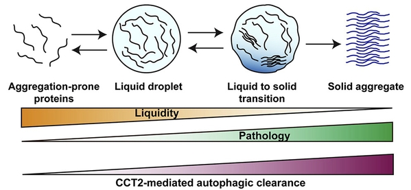 Fig.1 Phase transition and consolidation of aggregates and CCT2 mediated autophagic clearance of solid aggregates