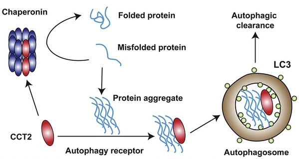 CCT2 is a subunit of the Chaperonin complex, which acts as a molecular chaperone to help correct misfolded proteins. Further investigation revealed that CCT2 mediates aggrephagy in its monomeric form, as only the monomeric form of CCT2 is able to expose the VLIR domain, the binding site to LC3.