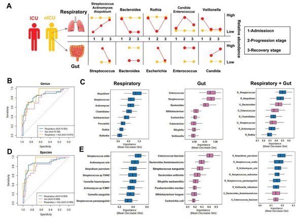 Figure3. Respiratory tract and gut microbial dynamics during COVID-19 progression and their diagnostic potential for disease severity
