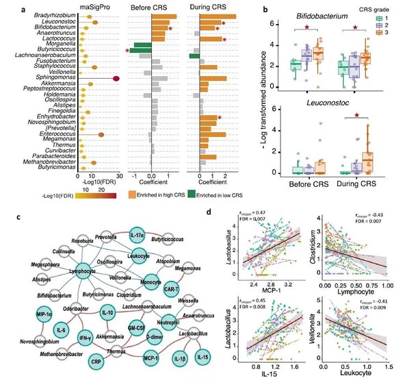 The researchers studied the relationship between the gut microbiome and CAR-T cell therapy-related CRS and therapeutic responses in relapsed and refractory multiple myeloma patients. By applying 16S rRNA sequencing technology and metabolic liquid chromatography mass spectrometry, the researchers discovered that patients descended dramatically in alpha diversity after CAR-T infusion, especially the patients with partly remission. In addition, bacteria, such as Bifidobacterium, Faecalibacterium, Sutterella, and Ruminococcus, were enriched in complete remission patients after CAR-T infusion, indicative of the correlation between bacterial abundance composition and therapeutic response. Moreover, associations between CRS grade and microbial composition were identified, with patients with severe CRS exhibiting higher abundance of Bifidobacterium, Leuconostoc, and Lactococcus.