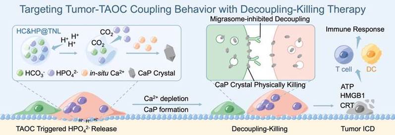 The team has previously developed liposomes that specifically release sodium bicarbonate in the acidic sealing zone of osteoclasts for preventing osteoporosis, and the related research is published in Journal of the American Chemical Society. Inspired by this strategy, they developed a new type of anti-osteoclast landmine. Dr. Chen introduced that there are two substances in this nano-scale liposome landmine: one is sodium bicarbonate, which can react with acid secreted by osteoclasts to produce gas, thus detonating the landmine; The other is sodium hydrogen phosphate. After the mine is detonated, hydrogen phosphate ions will form sharp calcium-phosphorus crystals with calcium ions in situ, which stab into the cell membrane of tumor cells and cause physical damage.