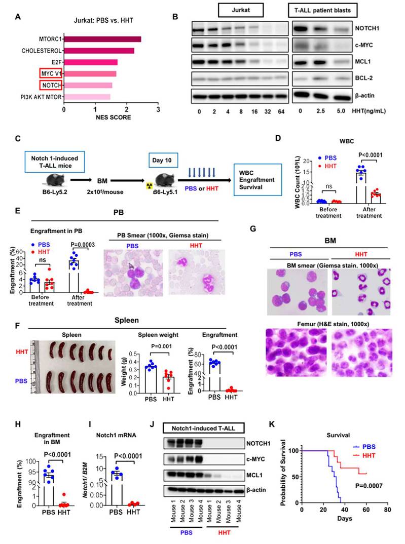 Finally, the study revealed that HHT inhibited the NOTCH1/MYC pathway in T-ALL. To gain further insight into antileukemic mechanisms of HHT in T-ALL cells, the researchers firstly performed RNA-seq on T-ALL cells treated with PBS or HHT. Results showed that both the MYC target V1 and NOTCH signaling pathways were among the top six gene sets altered by HHT treatment, with NOTCH1 and MYC downregulated. Then they validated the results by western blot analyses which showed an HHT dose-dependent downregulation of NOTCH1 and MYC both in T-ALL cell line and patient blasts. Furthermore, the researchers used a Notch1-induced T-ALL mouse model to confirm the HHT activity on NOTCH/MYC signaling and T-ALL in vivo. HHT-treated mice had significantly lower WBC counts, smaller spleens, decreased splenic/BM engraftment rates, and longer survival than vehicle-treated mice. They also observed significant reduction in the mRNA levels of Notch1 and protein levels of NOTCH1, c-MYC and MCL1 in the bone marrow cells from HHT-treated vs PBS-treated mice.