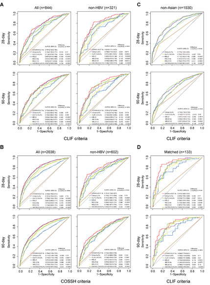 A simple and accurate prognostic score is crucial for making informed clinical decisions. The analysis revealed that the COSSH-ACLF II score achieved prognostic performance equivalent to the China-CLIF score in predicting 28- and 90-day LT-free mortality, and both outperformed other scoring systems. This advantage extended beyond patients meeting COSSH criteria to those meeting CLIF criteria, whether HBV- or non-HBV-related. Risk stratification using COSSH-ACLF II score effectively categorized patients into three distinct mortality risk groups. Validation in the CANONIC, PREDICT, and ACLARA cohorts confirmed the robustness of the China-CLIF score in non-HBV populations. A mimic validation of COSSH-ACLF II score, using organ failure frequency data from CANONIC, further supported its predictive superiority. Together, these findings establish the China-CLIF score as a globally validated tool, bridging Asian and non-Asian populations. COSSH-ACLF II score, as a simplified version, shows strong potential for routine clinical implementation.